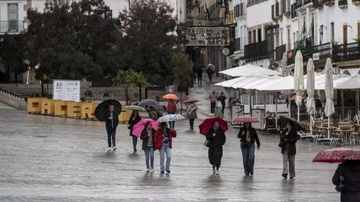 Cáceres bajo la lluvia. Cacereños en la plaza Mayor con los paraguas. / EL PERIÓDICO